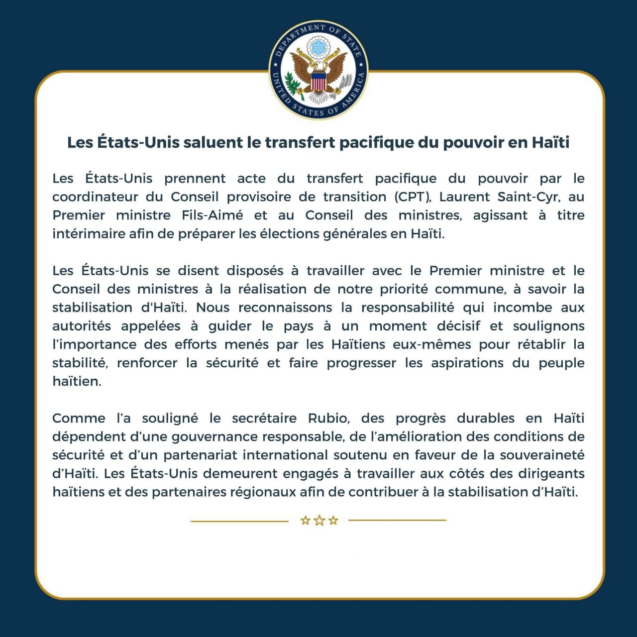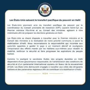 IMG-20260207-WA0025 Continue ReadingPrevious Washington salue le transfert du pouvoir et réaffirme son engagement pour la stabilisation d’Haïti